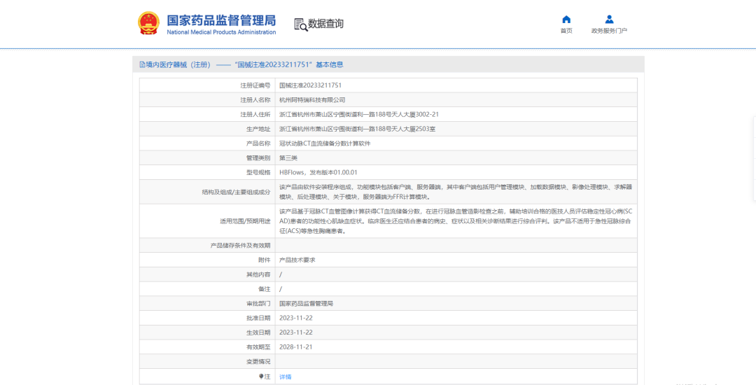 近日,国家药监局网站公开发布了最新一批三类医疗器械批准清单,杭州阿特瑞科技有限公司研发的《冠状动脉CT血流储备分数计算软件》(简称FFRCT)已经获批上市(图1),该软件核心算法完全自主研发,不受制于人。该产品由中美团队联合研发,双院士团队临床验证,是目前国内唯一采用人工智能技术和全三维流体力学方程+超级计算机计算且被商业保险公司认可的产品,也是目前被国家药监局认可不需要在“灰区”(介于0.75至0.85)和冠脉弥漫性病变进一步研究的无创医疗产品。
