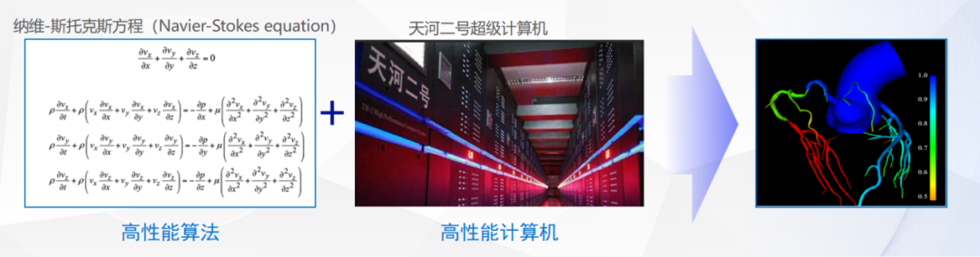 众所周知, FFR是心肌缺血评价的“金标准”,是临床判断是否对冠心病患者施血管内干预治疗的主要依据。传统方法是通过有创方法获得,近年来随着计算机技术的迅速发展,基于CT的无创FFR测量技术(即FFRCT)得到了快速发展。该技术起源于美国HeartFlow公司,其基本原理是基于常规CCTA所获得的冠状动脉三维图像,采用流体力学方程(纳维斯托克斯方程)在高性能计算机(超级计算机)上进行流体力学仿真计算,获得冠状动脉内血流动力学参数,例如血压、血流速度、血流量等,进而得到血流储备分数(FFR)(图2)。