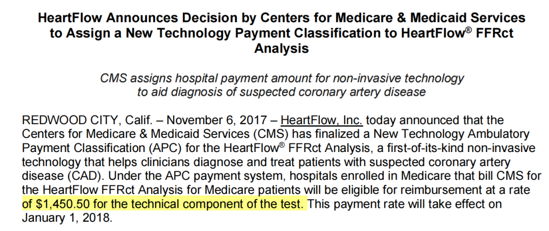 在此之前,要想从功能学上准确诊断冠心病的缺血风险,需要行有创的血流储备分数(FFR)检测。该检测在冠脉造影的基础上将一根0.35mm的金属压力导丝送至冠脉狭窄位置的后端,测量其压力,将该处压力与冠脉入口的压力进行比值,获得的值称为FFR值,如果该值小于等于0.80,则建议进行支架等积极的血管内干预治疗,否则建议保守治疗。该方法技术难度大(现在只有在部分高等级医院可以推行),成本高(一根压力导丝就要1万元),耗费时间长(需要住院3天),因此在国内使用量很少。而基于流体力学仿真原理的无创诊断技术(FFRCT),患者只需要在医院完成标准的CTA检查,然后,医生/工程师基于患者的CTA影像及一些基础的临床数据,利用流体力学仿真软件即可计算获得患者的FFR值,真正实现了无创、精准、低成本、便捷的诊断。 美国HeartFlow公司的FFRCT从2014年开始在欧美日韩等发达国家进行了广泛应用,被写入多个临床指南,且多个保险产品都可报销相关的检查费用,从2018年1月1日起,美国医保报销金额为1450.5美元/例(图3)。
